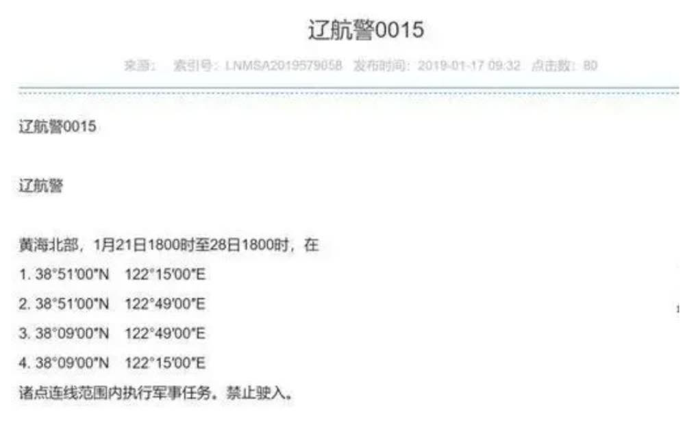 2月9号,大连海事局发布了一则航行警告,称13号0800时到17号1600时在黄海北部某海域进行实弹射击,禁止驶入。