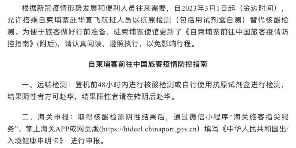 中国驻柬使馆最新通知!自柬赴华旅客疫情防控要求!