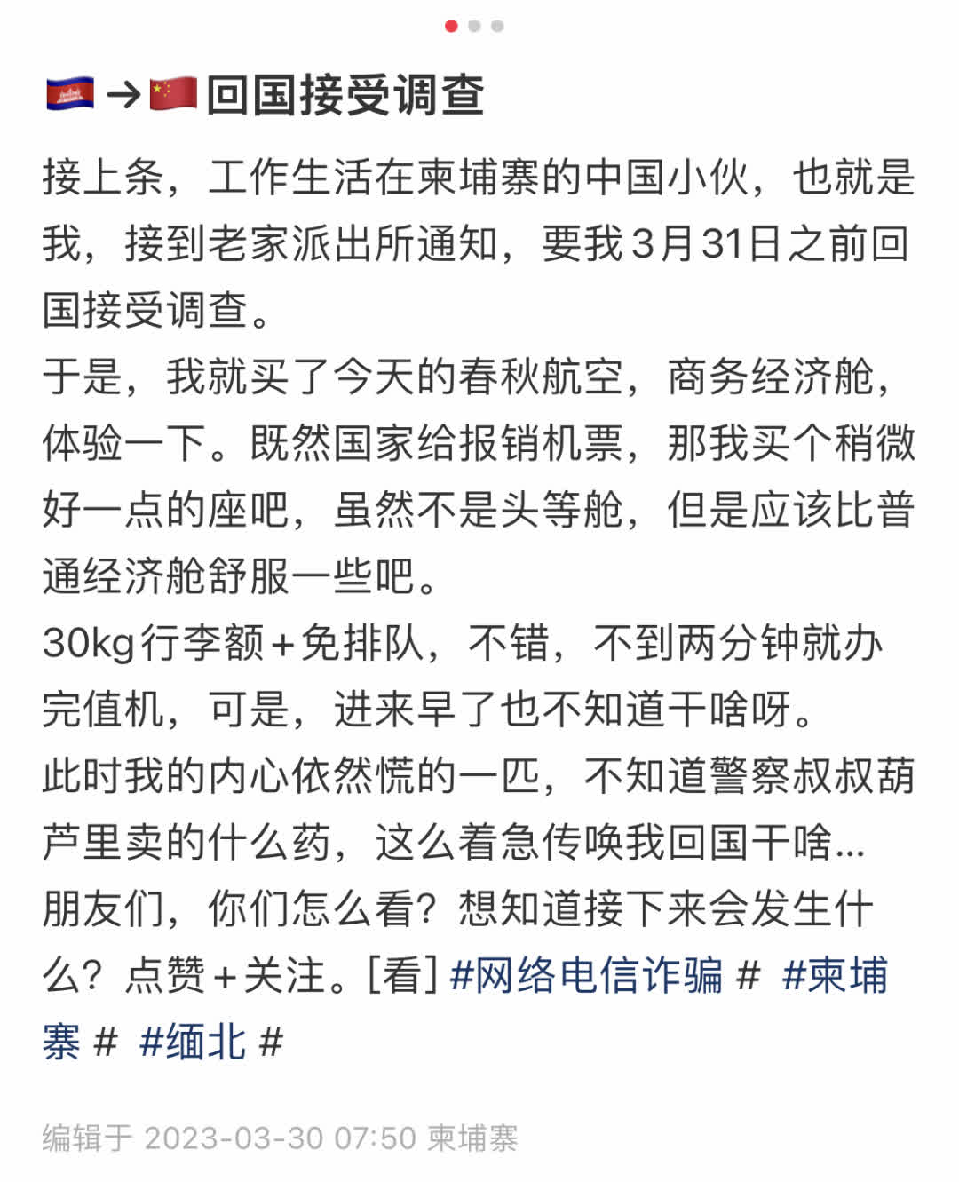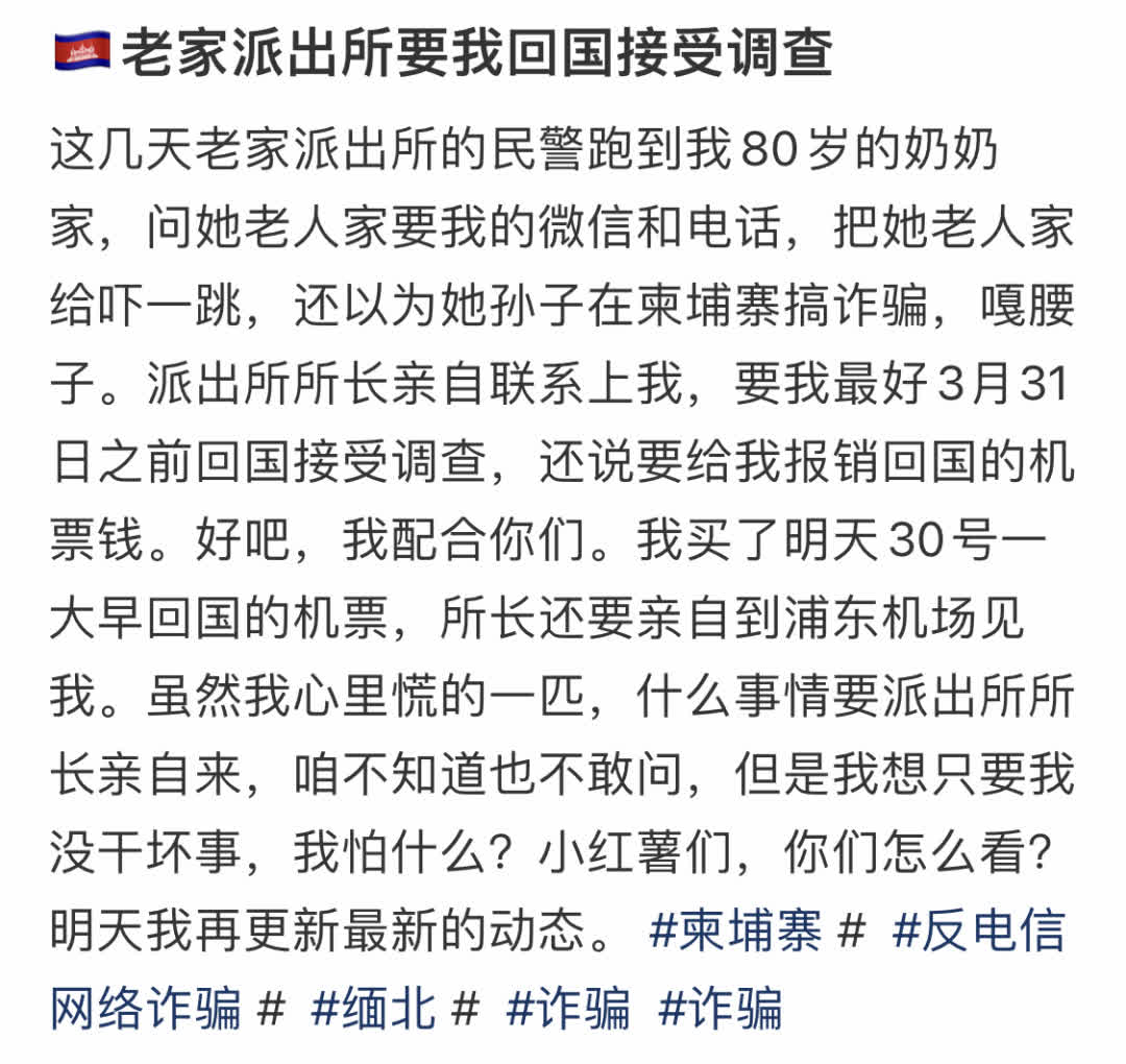 近日,一名在柬埔寨工作的网友表示,他突然接到家乡派出所的电话,要求他回国配合调查,并表示会给他报销机票。他在小红书连续更新了回国的全过程,引发了网友的关注。