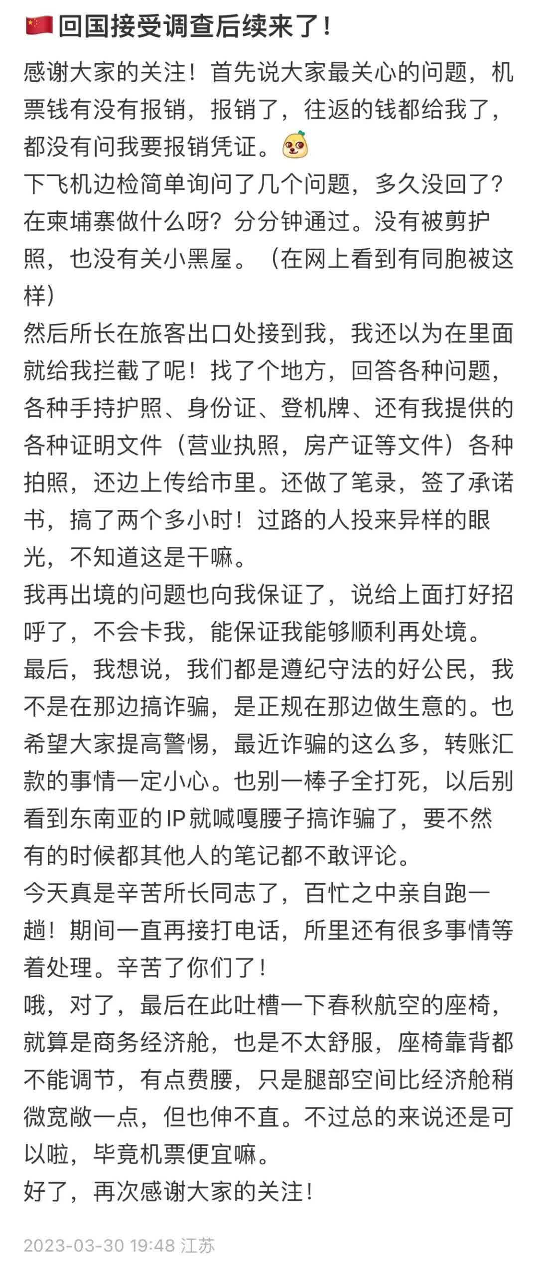 3月30日晚,这位网友再次发帖,表示已经已经平安回国,果然如之前承诺的那样,派出所所长亲自来接机,还报销了来回的机票。