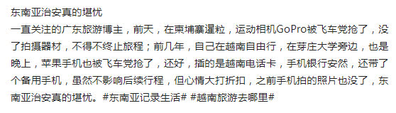 有网友指出,此前他一直关注的广东旅游博主,在柬埔寨暹粒旅游,运动相机GoPro被飞车党抢了,没了拍摄器材,不得不终止旅程。他还感叹东南亚治安真的堪忧。