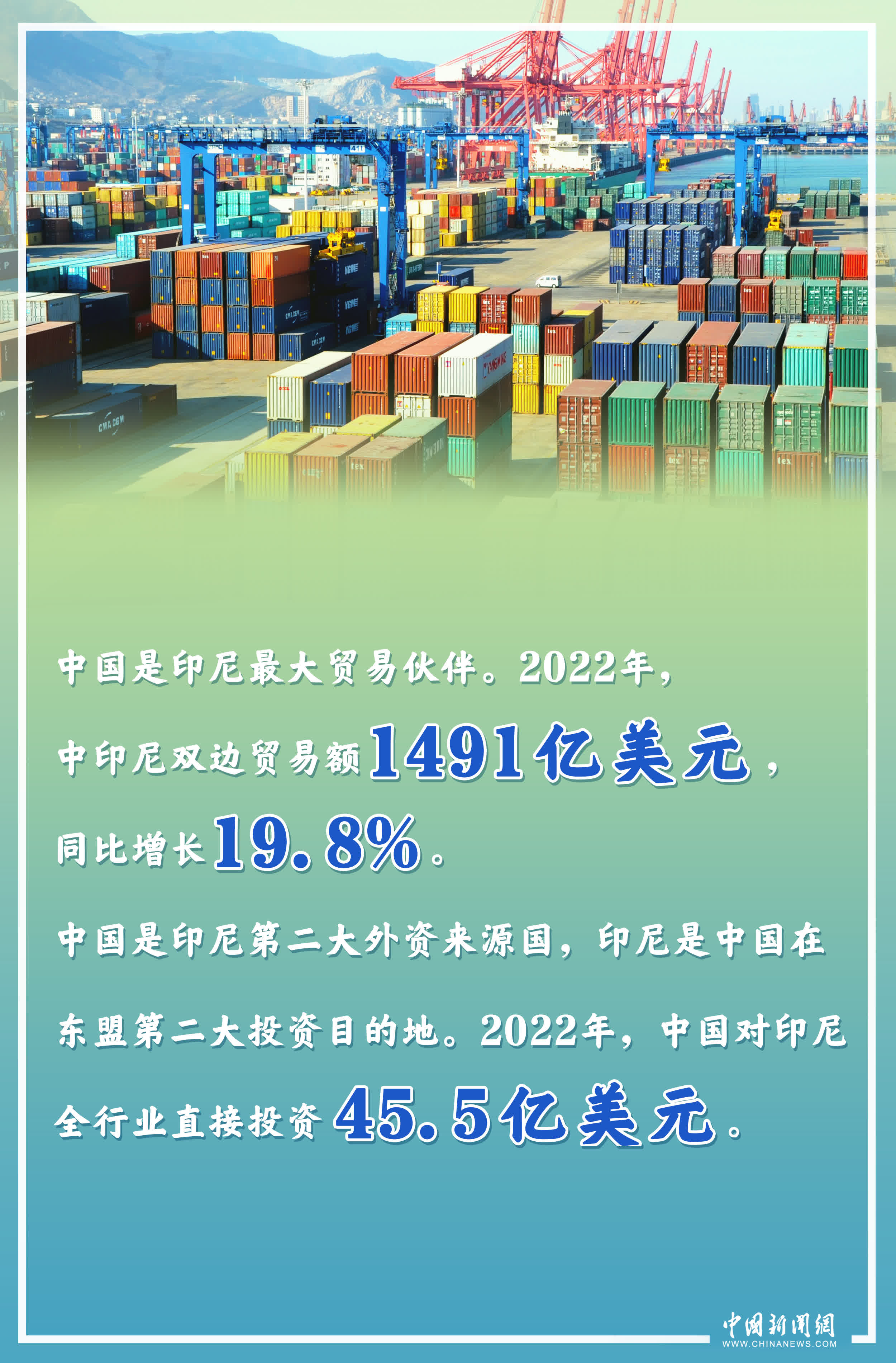 中国是印尼最大贸易伙伴。2022年,中印尼双边贸易额1491亿美元,同比增长19.8%。中国也是印尼第二大外资来源国,印尼是中国在东盟第二大投资目的地。2022年,中国对印尼全行业直接投资45.5亿美元。