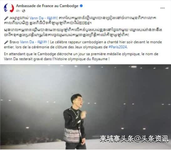 【柬埔寨头条综合报道】据柬埔寨驻法国大使馆8月12日脸书发文称,柬埔寨歌手万达在2024年巴黎奥运会闭幕式上献唱,他的名字将载入柬埔寨参加奥运会的历史。