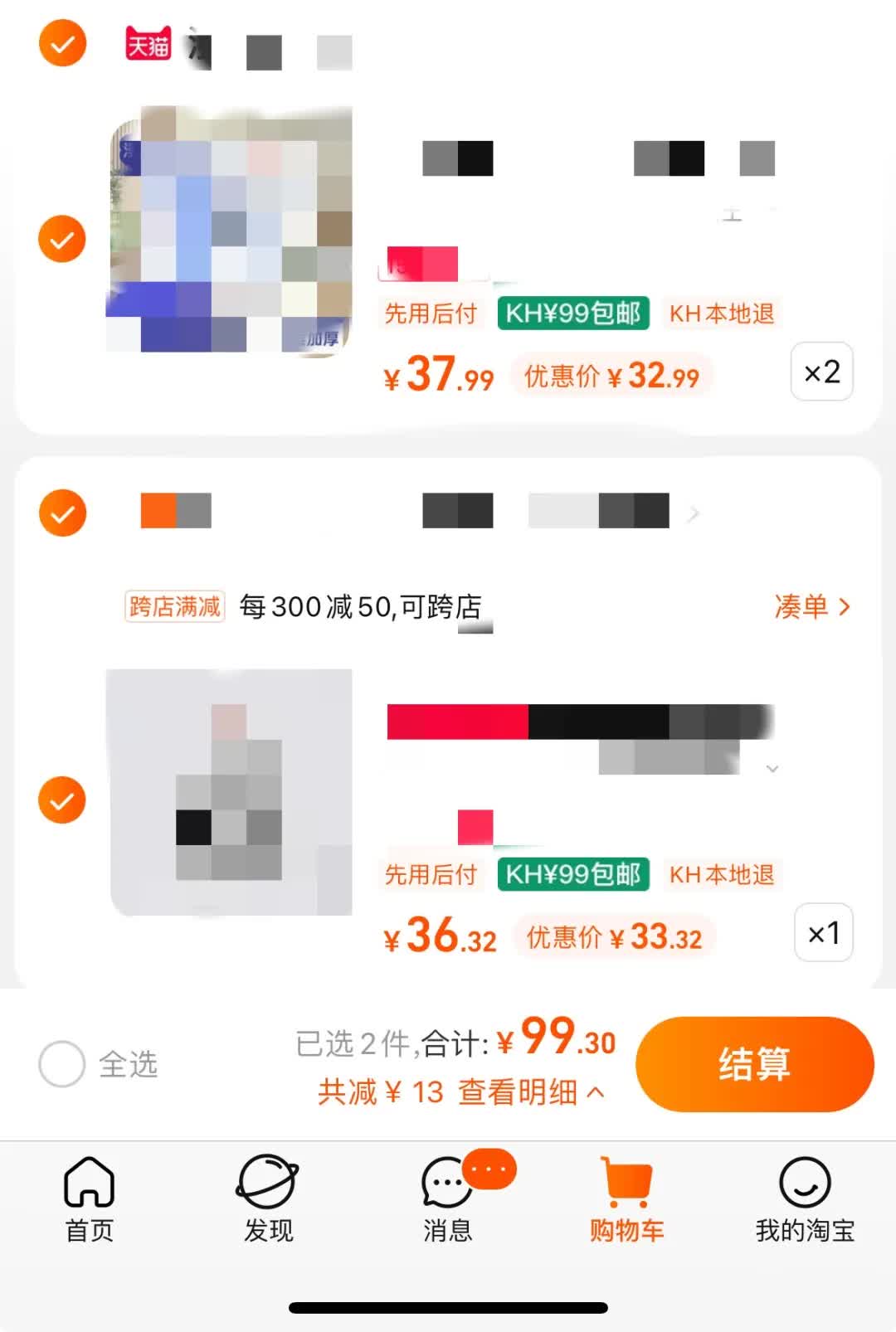 购物车里可选多家带有“KH¥99”标识的商品一起下单,若选中的其中一个商品没有该标识则不能享受满99元包邮的服务!(如果购买的商品金额达不到,在这里,建议大家也可以和朋友一起拼满)