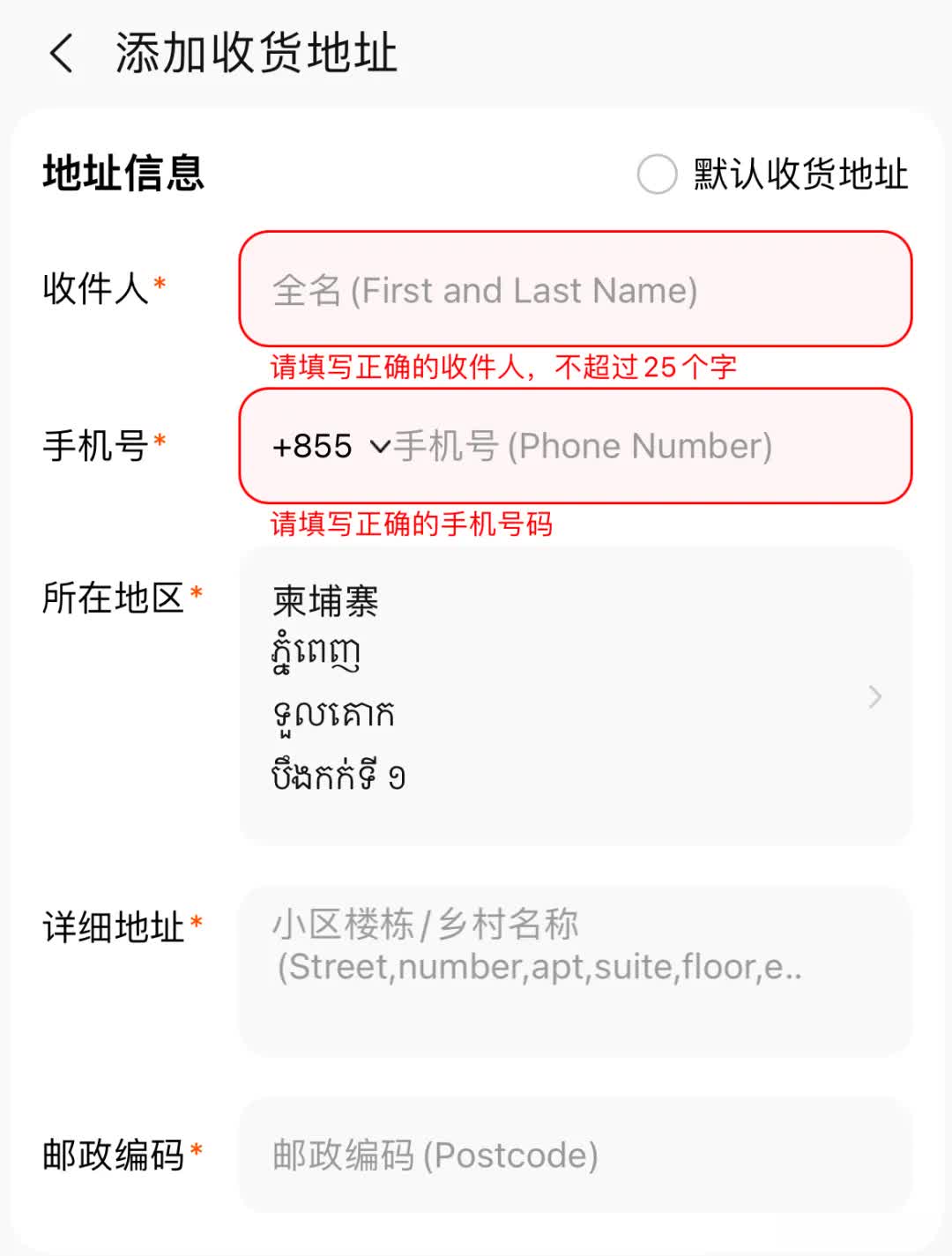 填写收货地址:填写收件人、手机号码以及在柬埔寨的住址等信息。