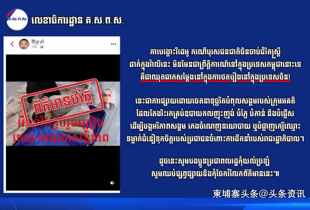 当局指出,相关视频内容系虚构,不属实,呼吁公众不要误信误传。声明强调,此类虚假信息的传播往往由不法分子蓄意操纵,意图扰乱社会秩序、制造恐慌,并通过歪曲事实来误导公众、挑起敌意,甚至借此谋取政治利益或损害柬埔寨的国家形象。