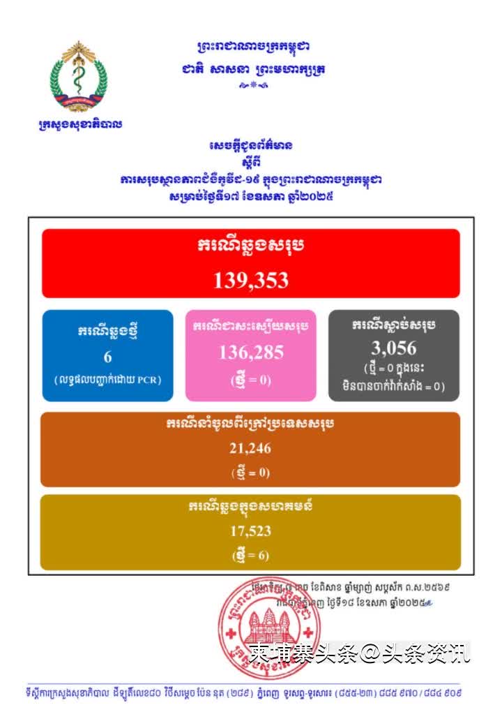 【柬埔寨头条综合报道】柬埔寨卫生部发布通告称,5月18日,全国新增6例新冠肺炎确诊病例。当天未报告新增治愈病例或死亡病例。