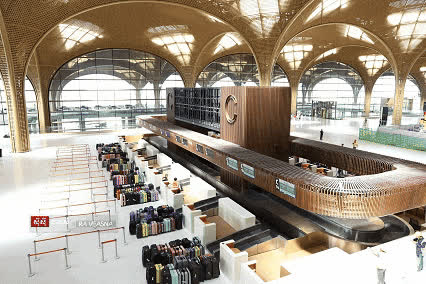 高挑通透的玻璃幕墙与多曲面铝格栅吊顶相得益彰,既展现出浓郁的柬埔寨风情,又不失现代建筑的恢弘大气。从远处眺望,整个机场宛如一件精美的艺术品,在阳光下熠熠生辉。