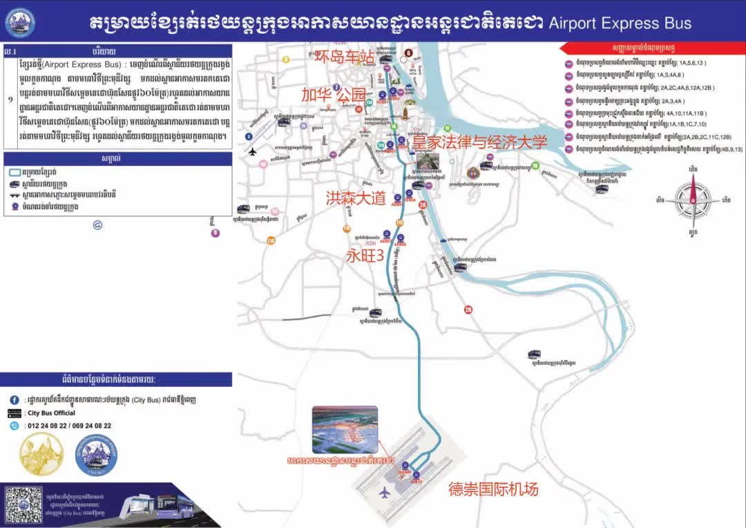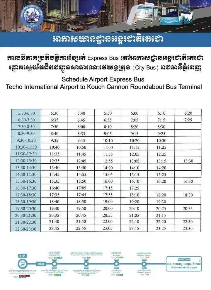 为方便金边市区至德崇国际机场的通行,当地政府特地开通了机场专线,运行时间为早上5时30分至晚上11时30分,约每15至20分钟一班,费用为1500瑞尔,总行程约1小时。