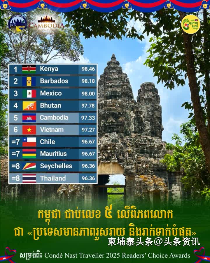 中国大使于10月9日在脸书发文写道:"祝贺柬埔寨!在《Condé Nast Traveller》'2025读者之选'评选中位列'全球最友好国家'第五名。"