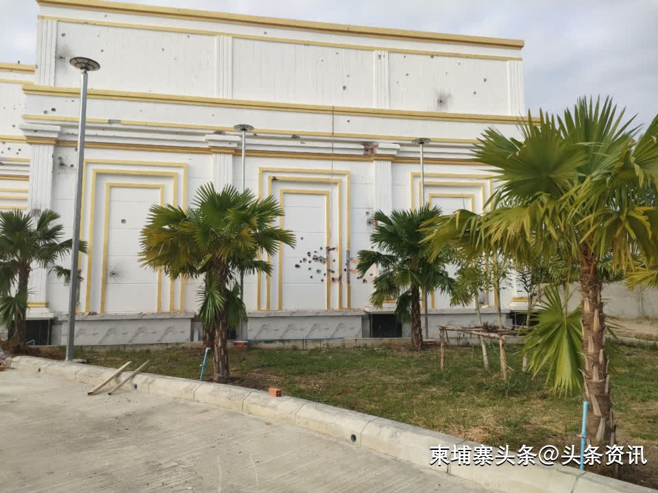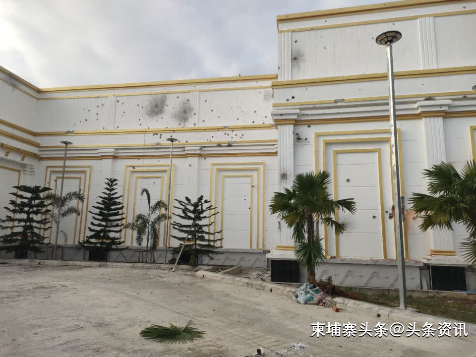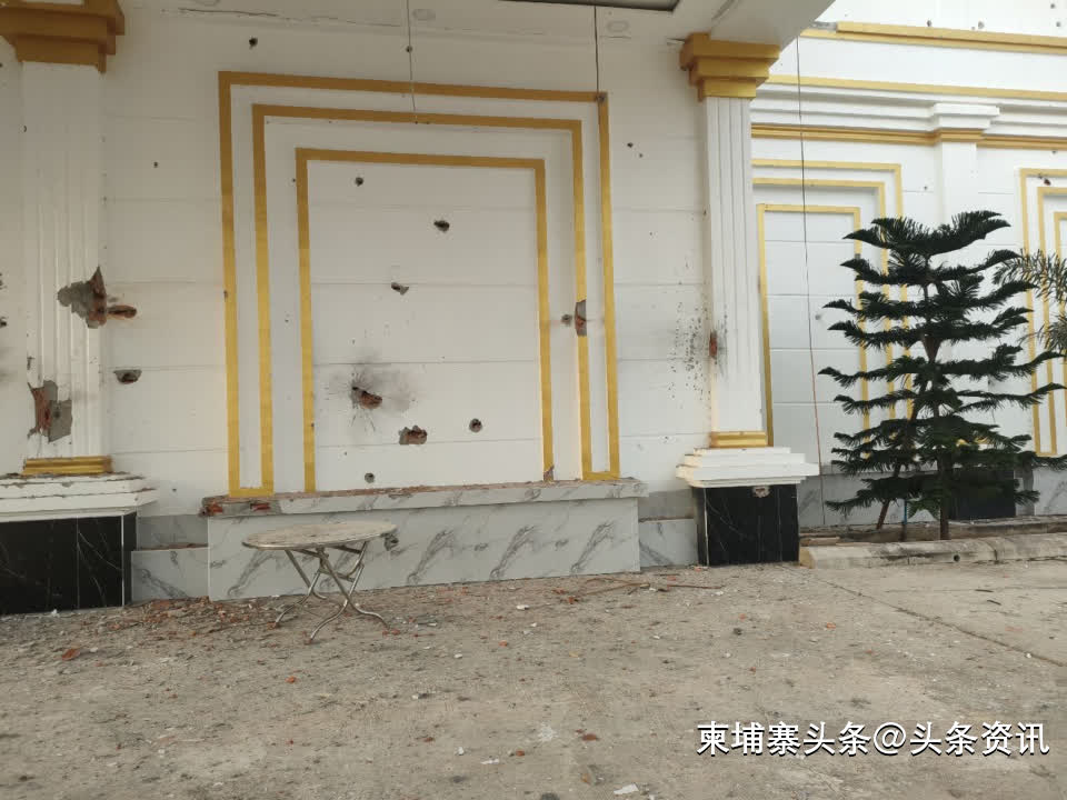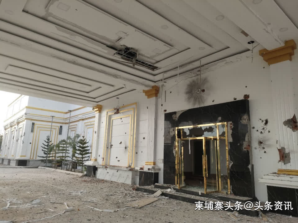 柬媒发布的现场照片显示,泰军炮弹落入菩萨省韦文县特莫达地区一处赌场建筑。照片中可见,赌场外墙布满弹孔,多处出现爆炸破损,入口区域严重受毁,玻璃与墙体碎片散落一地,现场满目疮痍。