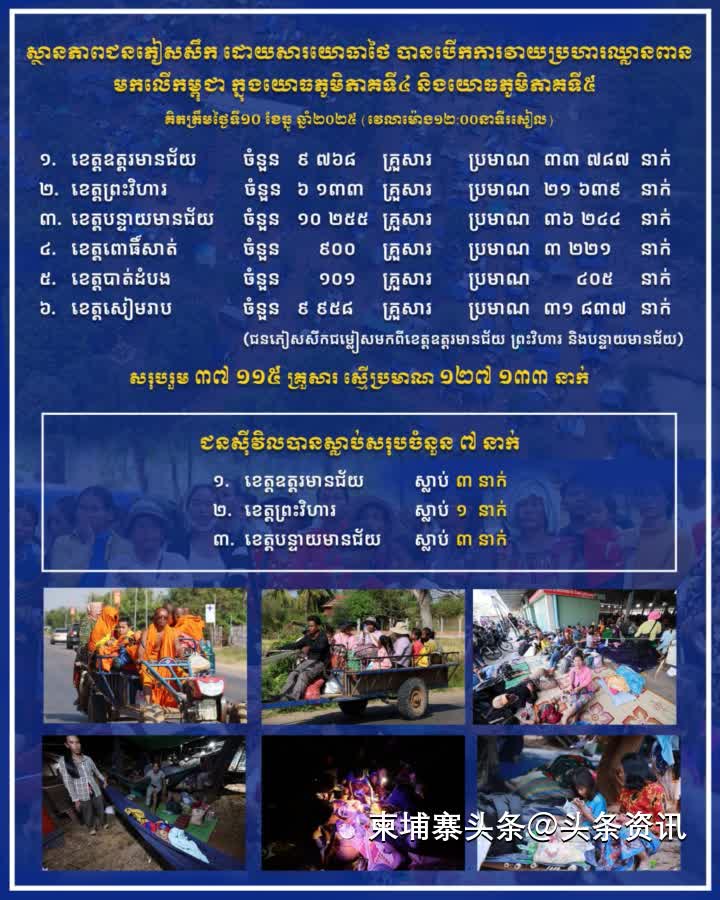 【柬埔寨头条综合报道】柬埔寨国防部发布的通告称,截至12月10日下午12时,因泰军袭击柬埔寨事件中,已造成柬埔寨7名平民丧生,流离失所难民增至37,115户家庭,总计127,133人。