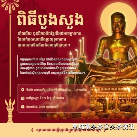 【柬埔寨头条综合报道】据柬媒消息,金边皇家美术大学将于12月12日18时起在校园内(国家博物馆后方)举行祈福仪式,为正在边境抵御入侵、保卫国家的柬埔寨前线军人祈愿平安。