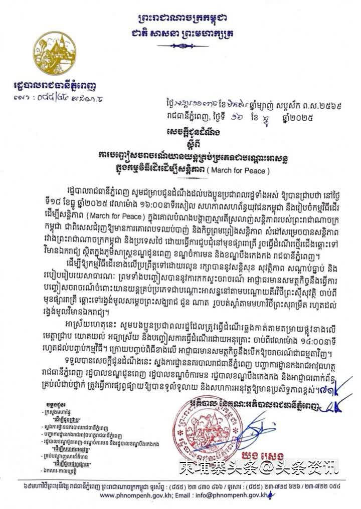 【柬埔寨头条综合报道】据金边市政府发布的通告,12月18日下午4点,柬埔寨青年联合会将组织举行"和平游行"活动,旨在展示柬埔寨王国热爱和平的精神,特别是促进停火协议的尊重与和平协定的达成,以实现在柬埔寨与泰国之间取得和平。