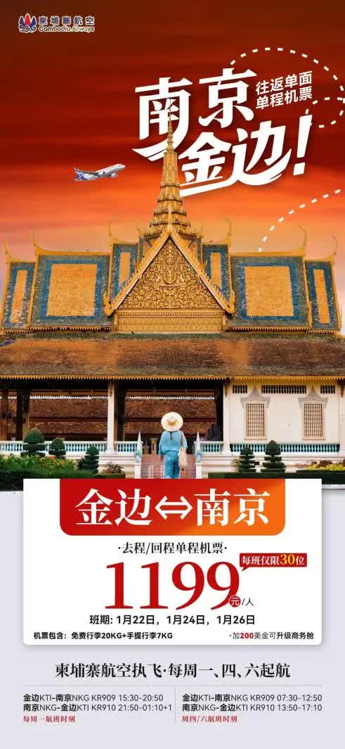 “金边—南京”启航,润邦携柬埔寨航空推特价机票