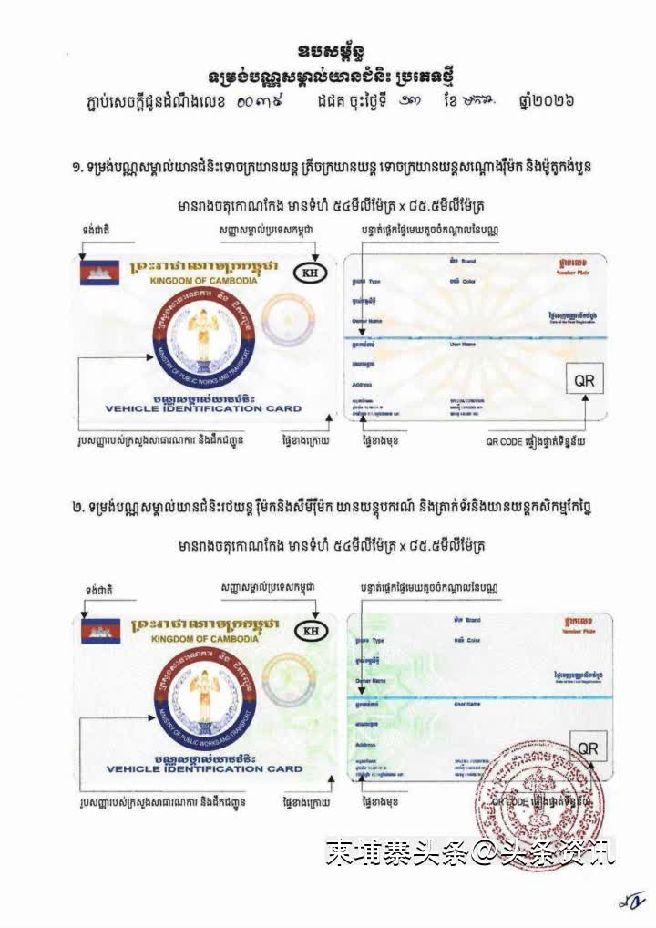 【柬埔寨头条综合报道】据柬媒消息,柬埔寨公共工程与运输部发言人潘林近日表示,为强化车辆管理、维护社会治安秩序,并有效遏制偷税漏税及造假行为,该部已正式推出应用尖端防伪技术的新版车辆登记证。