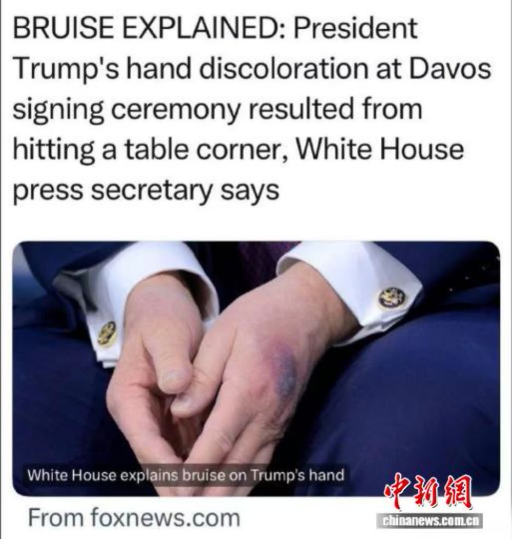 据美国福克斯新闻台23日报道,白宫新闻秘书莱维特表示,特朗普在瑞士达沃斯“和平委员会”签约仪式上左手撞到了桌角导致“淤青”,之前手上并无淤青。