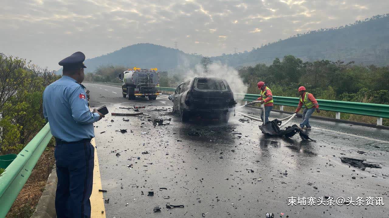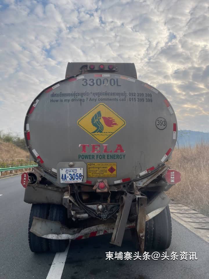 【柬埔寨头条综合报道】据柬媒消息,2026年1月28日上午约7时30分,金港高速公路)实居省普农斯罗县路段发生一起惨烈交通事故。在高速公路PK 93+400处,一辆黑色雷克萨斯轿车撞上前方同向行驶的油罐车尾部。