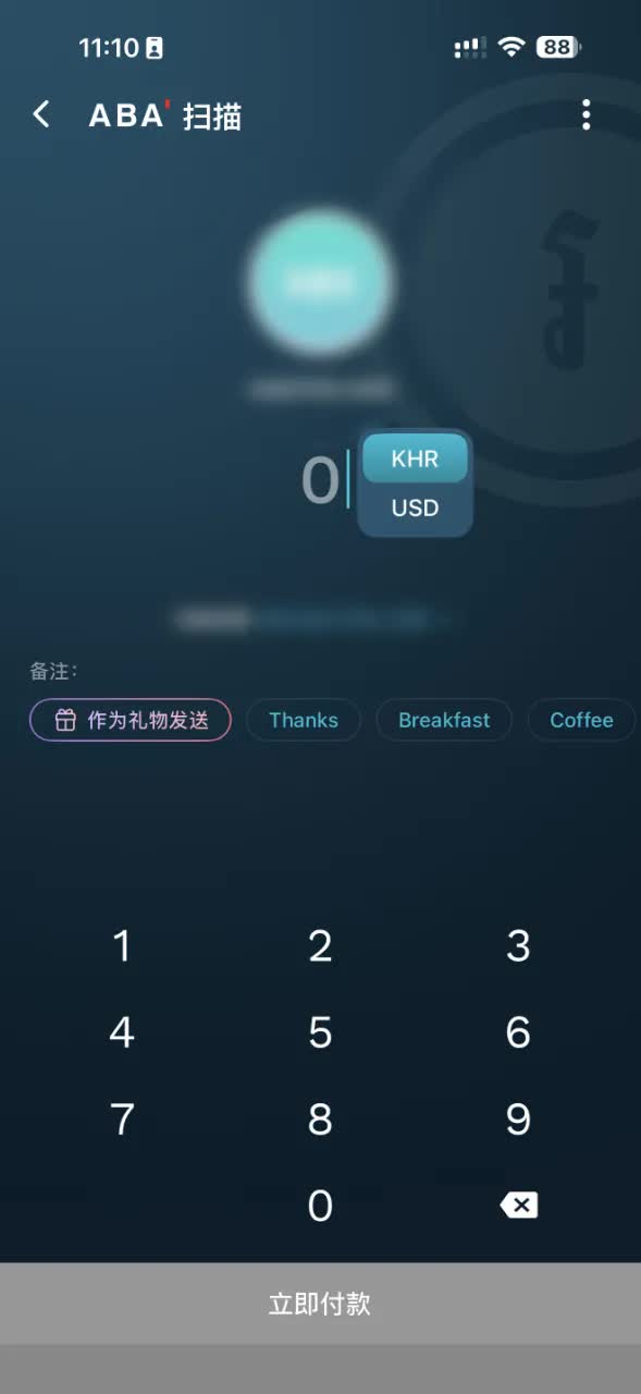 柬埔寨头条记者在使用时发现,ABA银行手机app的收款码和付款码已经合并到了一起。之前打开收付款码,二维码中间会出现一个瑞尔或者美元币种图标,用户在付款时可以一目了然的看到支付的币种,现在二维码中间出现的是巴孔系统的图标,而用户付款输入金额时,旁边会出现瑞尔和美元币种单位。