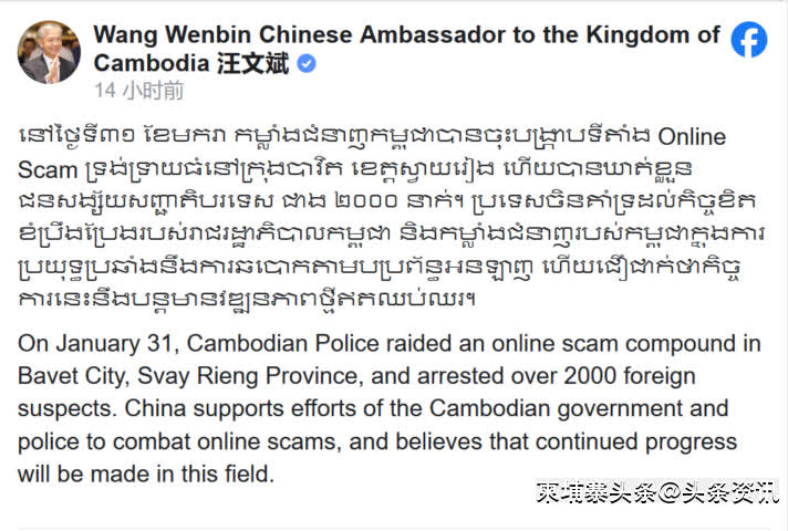 【柬埔寨头条综合报道】据柬媒消息,中国驻柬埔寨大使汪文斌于2026年2月2日晚通过个人脸书发文,明确表态中方支持柬埔寨政府及警方在打击网络诈骗领域所付出的努力,并坚信这一工作将不断取得新的进展。