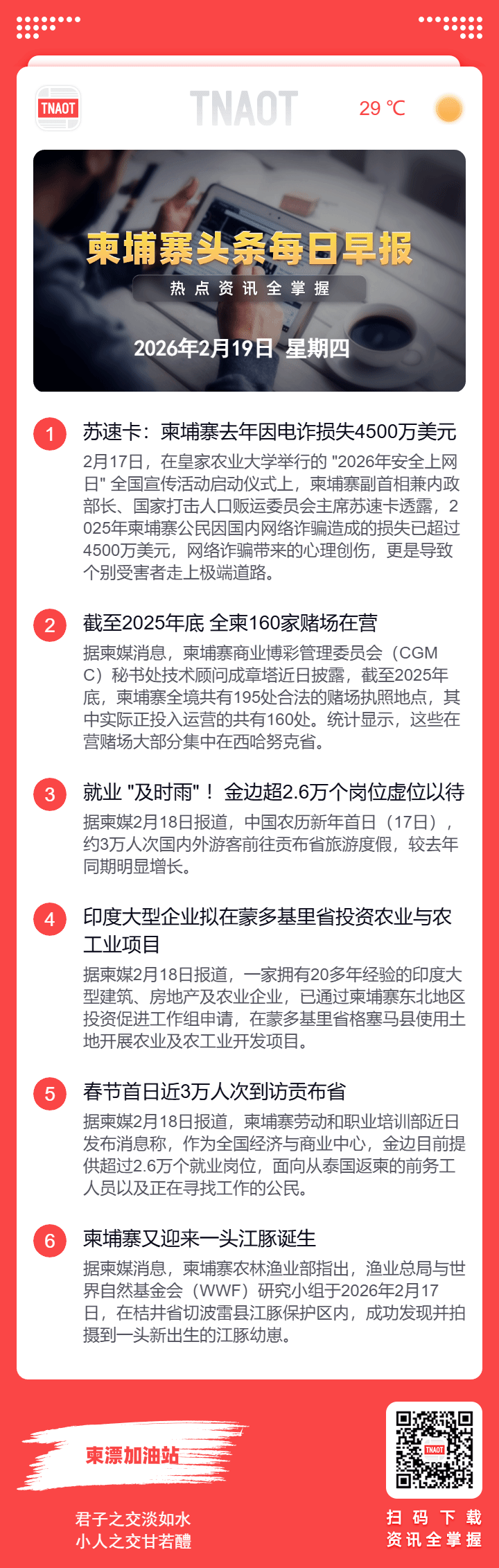 2月19日柬埔寨头条早报|苏速卡:柬埔寨去年因电诈损失4500万美元