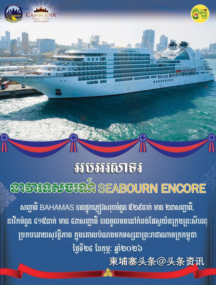 【柬埔寨头条综合报道】据柬媒消息,2026年2月24日,柬埔寨旅游部迎来一艘巴哈马籍邮轮“SEABOURN ENCORE”停靠西港。该邮轮载有23个国籍的529名游客,以及43个国籍的415名船员。