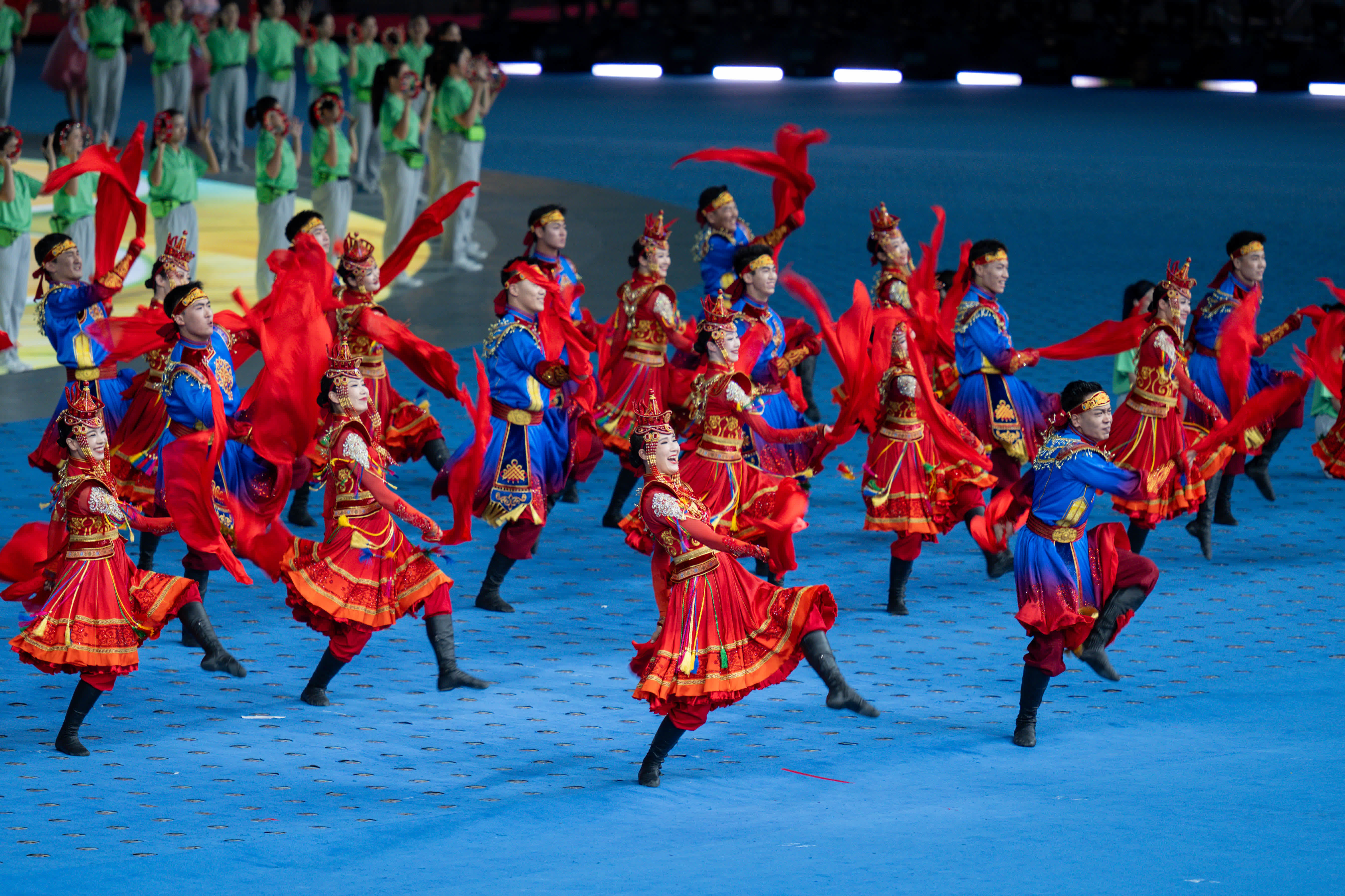 资料图:2024年11月22日晚,第十二届全国少数民族传统体育运动会开幕式在海南省三亚市体育中心体育场举行。图为内蒙古自治区代表团驻停表演。中新社记者 骆云飞 摄