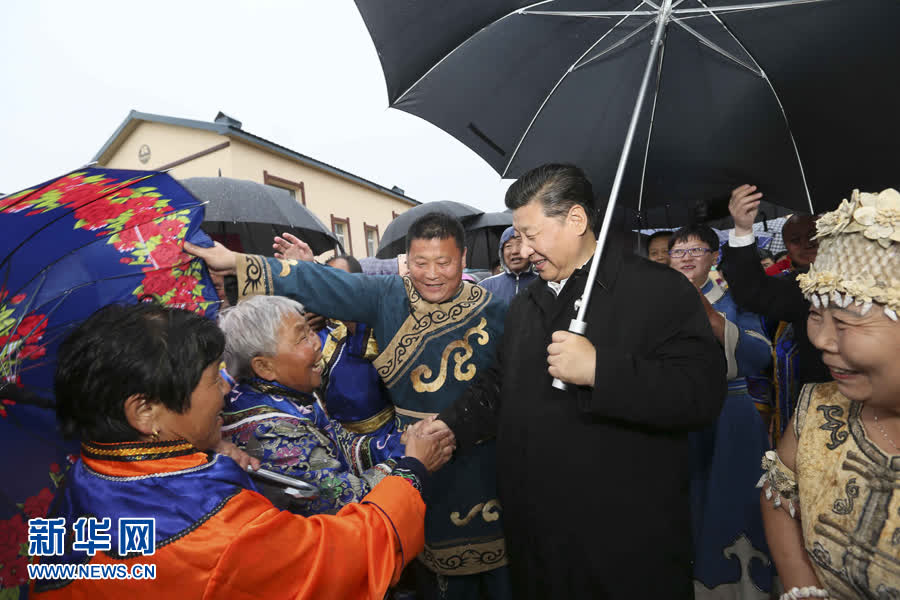 2016年5月24日下午,习近平在佳木斯市同江市八岔赫哲族乡八岔村冒雨与村民们交谈。新华社记者 兰红光 摄