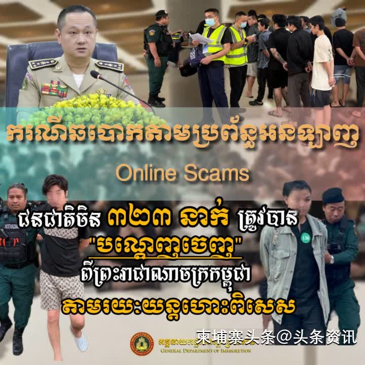 【柬埔寨头条综合报道】据柬媒消息,2026年2月27日,在副首相兼内政部长苏速卡的直接指导下,移民总局局长宋威西那指示调查与执法局,联合中国驻柬埔寨大使馆,将此前在金边专项打击行动中抓获的323名涉嫌电信诈骗(Online Scams)的中国籍嫌疑人(含5名女性)正式遣返回国。