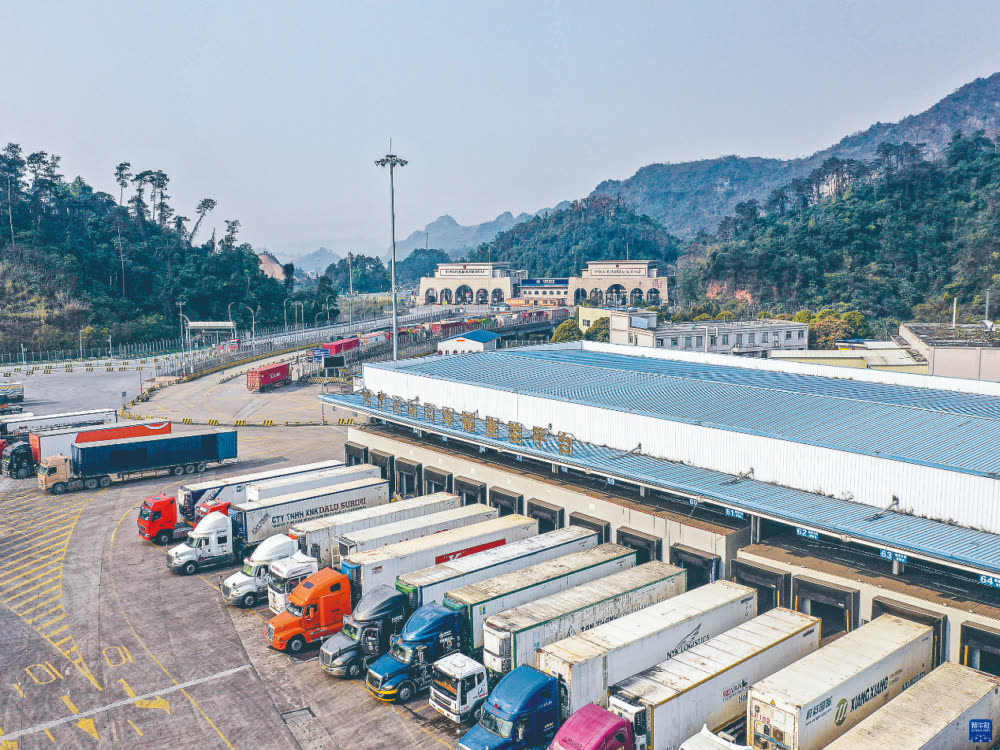 在广西凭祥友谊关口岸冷链查验平台,装有来自东盟国家水果的货车等待查验通关。广西创建东盟数智赋能链、融入大区域合作链,“北上广研发+广西集成+东盟应用”的特色发展路径正加快形成,广西区域联动发展向纵深推进,一批企业在北部湾沿线“多点落子”觅新机。新华社记者 曹祎铭 摄