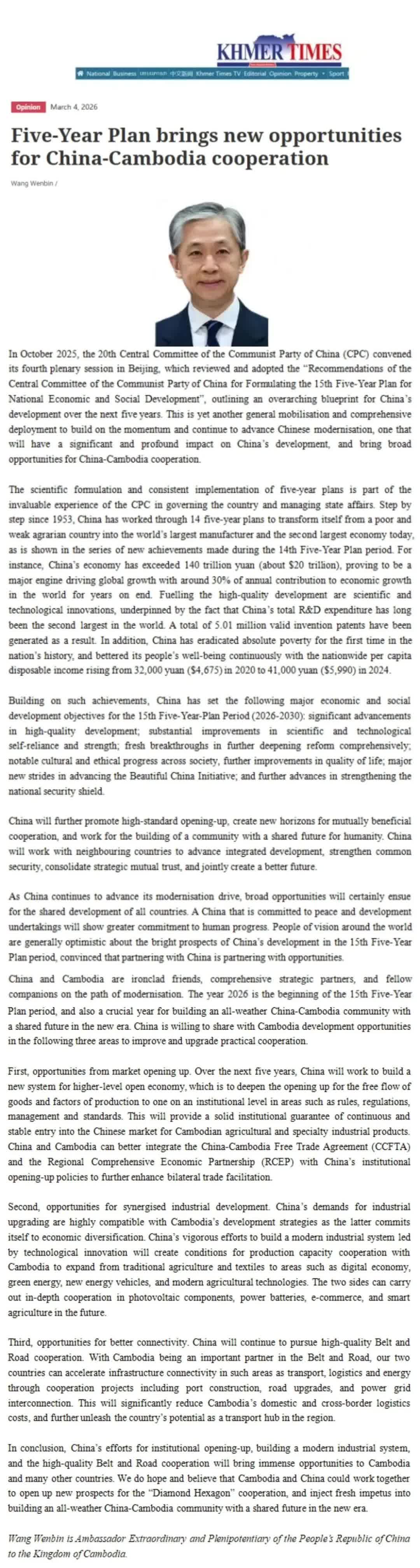 2026年3月4日,驻柬埔寨大使汪文斌在柬主流媒体《高棉时报》、酸角树网站和《柬华日报》发表署名文章《“十五五”规划为中柬合作带来新机遇》。