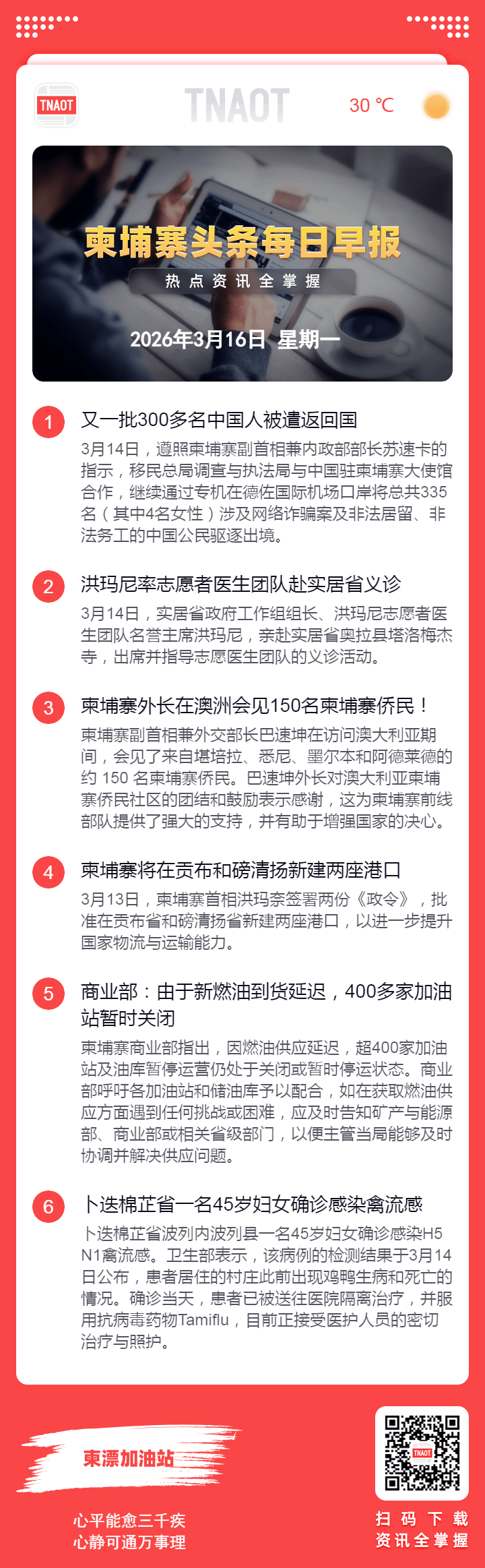 3月16日柬埔寨头条早报 | 又一批300多名中国人被遣返回国