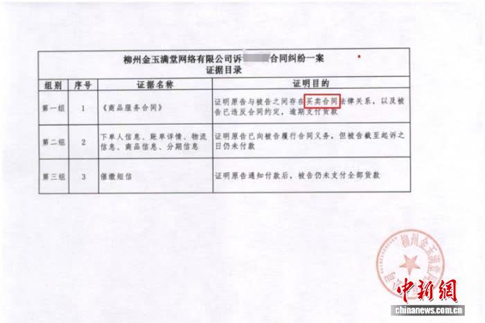 金玉满堂提交的证据目录显示,其与孙乐签署的合同为买卖合同。 受访者供图
