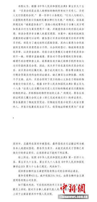 孙乐出具的法院判决书显示,法院审理认为,被告的抗辩及其提供的证据可以证明:被告签订买卖合同的真实目的并非购买手机,而是为了通过该形式获取贷款。其内心真意与合同表面所呈现的买卖意思表示不符。从合同的签订,物流转寄及签收异常,以及资金流转,均显示该交易模式与通常手机买卖合同不一致。即便非直接通谋,原告对不符合常理的交易安排,难谓尽到合理审查义务。故原被告双方缺乏转移手机所有权与支付价款的真实合意。因此,双方并不存在真实的买卖合同关系,该买卖合同应属无效。