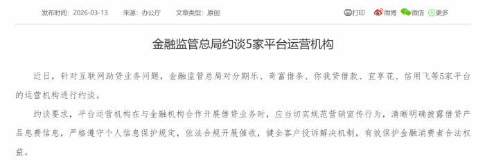 3月13日,国家金融监管总局发布消息称,约谈5家平台运营机构。