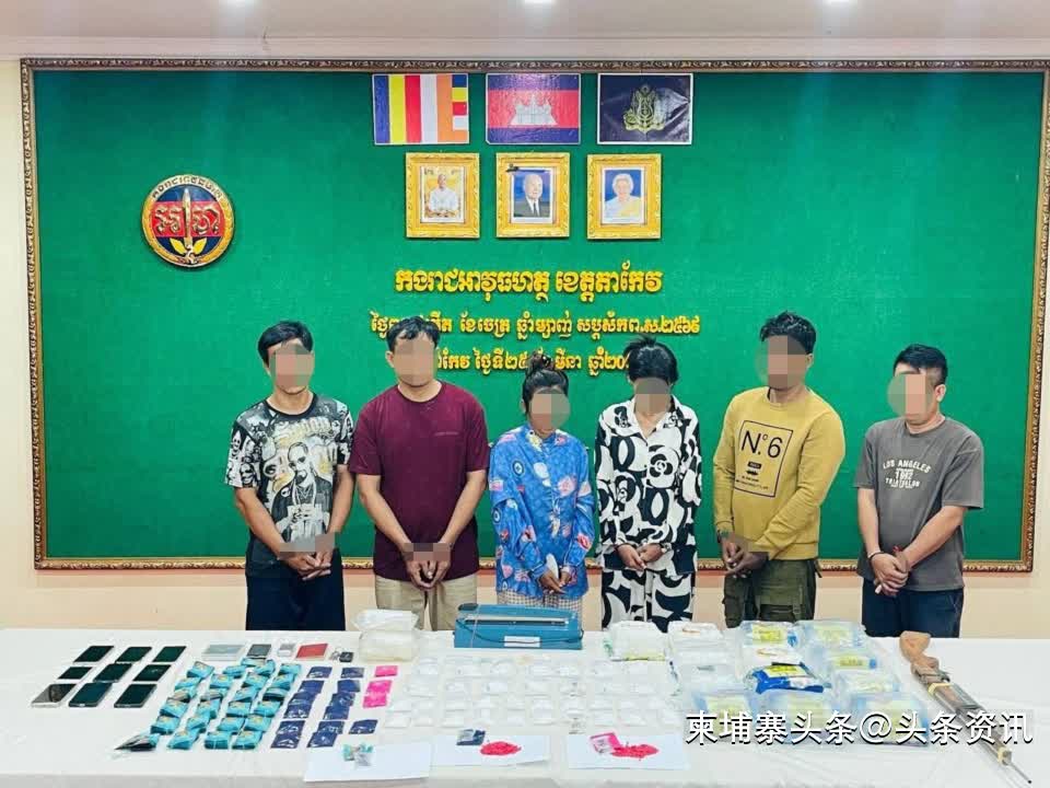此次行动共逮捕6名嫌疑人(含2名女性),分别来自茶胶、金边、卜迭棉芷及柴桢省,均为无业人员。执法人员在现场共缴获逾15公斤毒品(主要为冰毒)、1辆雷克萨斯汽车、3辆摩托车、1辆三轮车、9部手机、1把自制枪支、3台毒品秤、1台封口机,以及部分护照和包装材料。