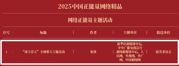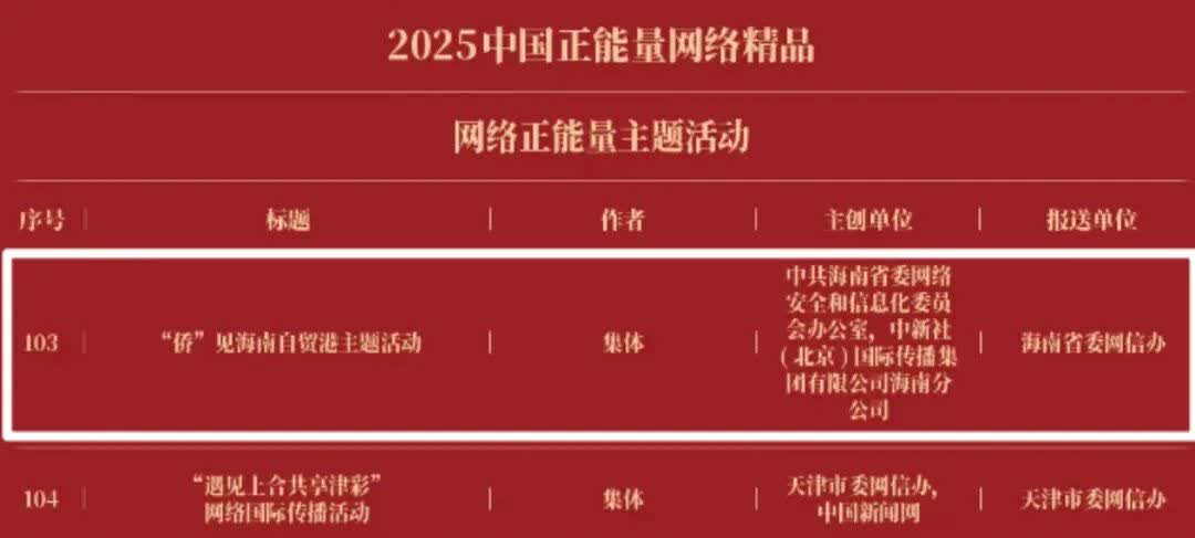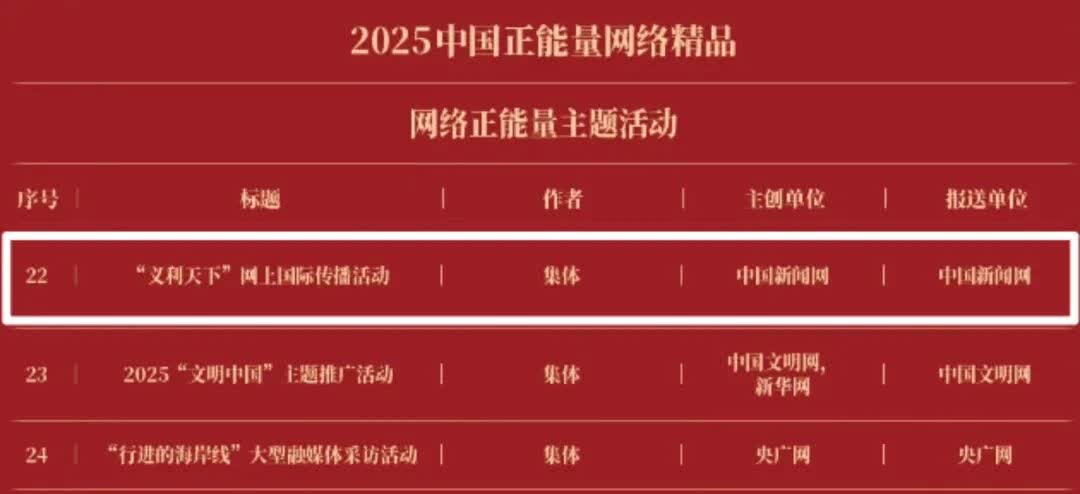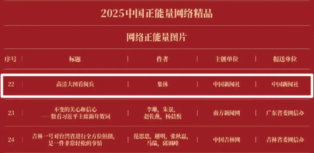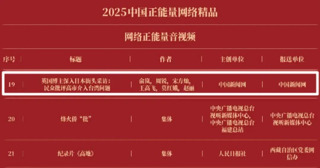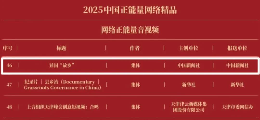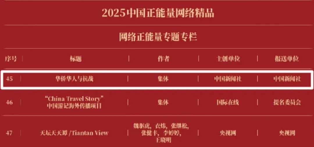 《“新漫评”系列漫画》《“三里河”专栏》入选2025中国正能量网络正能量十佳网络精品。 《高清大图看阅兵》《青春的关键词,是他们的模样》入选2025中国正能量网络精品网络正能量图片;《英国博主深入日本街头采访:民众批评高市介入台湾问题》《异国“故乡”》入选2025中国正能量网络精品网络正能量音视频;《“习言道”专栏》《华侨华人与抗战》入选2025中国正能量网络精品网络正能量专题专栏;《“冰雪春天”全网重大主题活动》《“义利天下”网上国际传播活动》《“探店1天”系列报道》《“侨”见海南自贸港主题活动》《“遇见上合共享津彩”网络国际传播活动》入选2025中国正能量网络精品网络正能量主题活动。