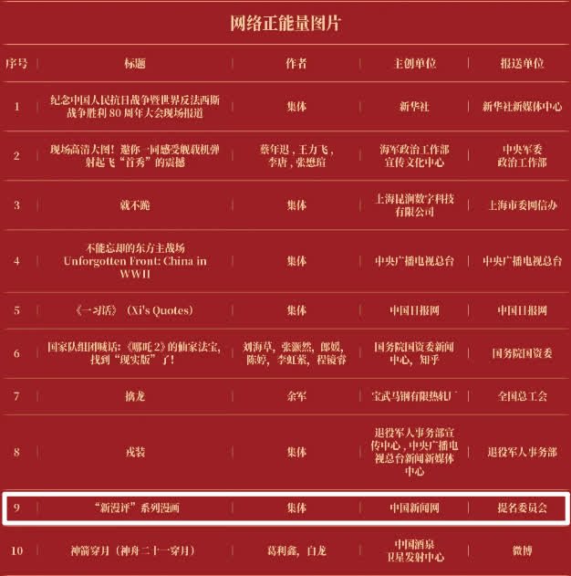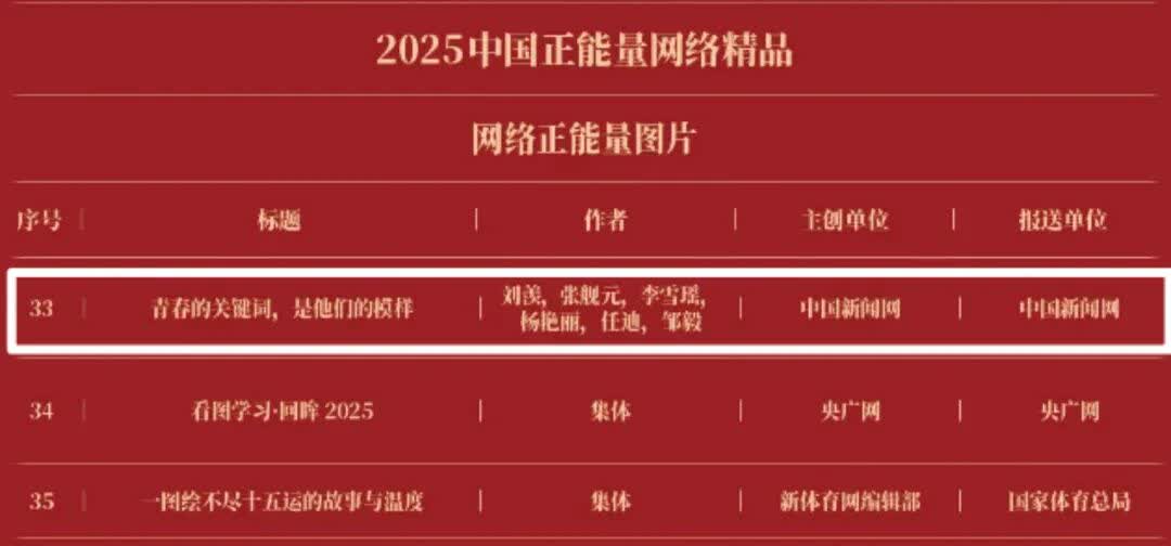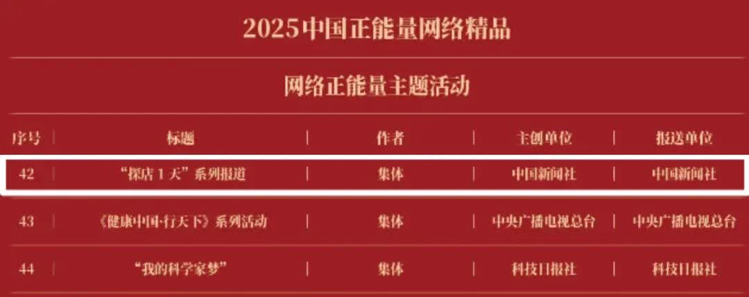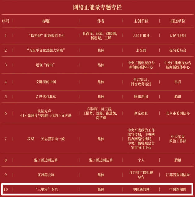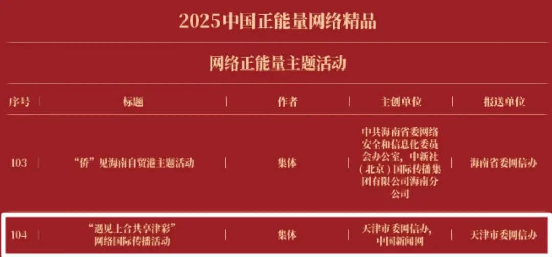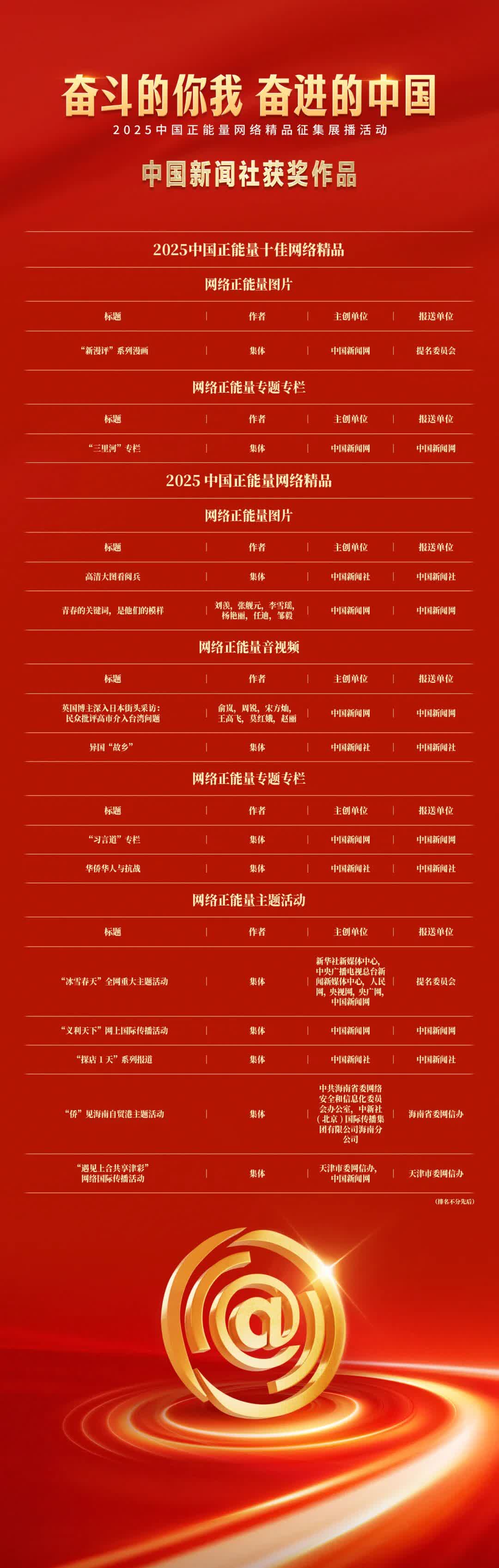 《“新漫评”系列漫画》《“三里河”专栏》入选2025中国正能量网络正能量十佳网络精品。 《高清大图看阅兵》《青春的关键词,是他们的模样》入选2025中国正能量网络精品网络正能量图片;《英国博主深入日本街头采访:民众批评高市介入台湾问题》《异国“故乡”》入选2025中国正能量网络精品网络正能量音视频;《“习言道”专栏》《华侨华人与抗战》入选2025中国正能量网络精品网络正能量专题专栏;《“冰雪春天”全网重大主题活动》《“义利天下”网上国际传播活动》《“探店1天”系列报道》《“侨”见海南自贸港主题活动》《“遇见上合共享津彩”网络国际传播活动》入选2025中国正能量网络精品网络正能量主题活动。