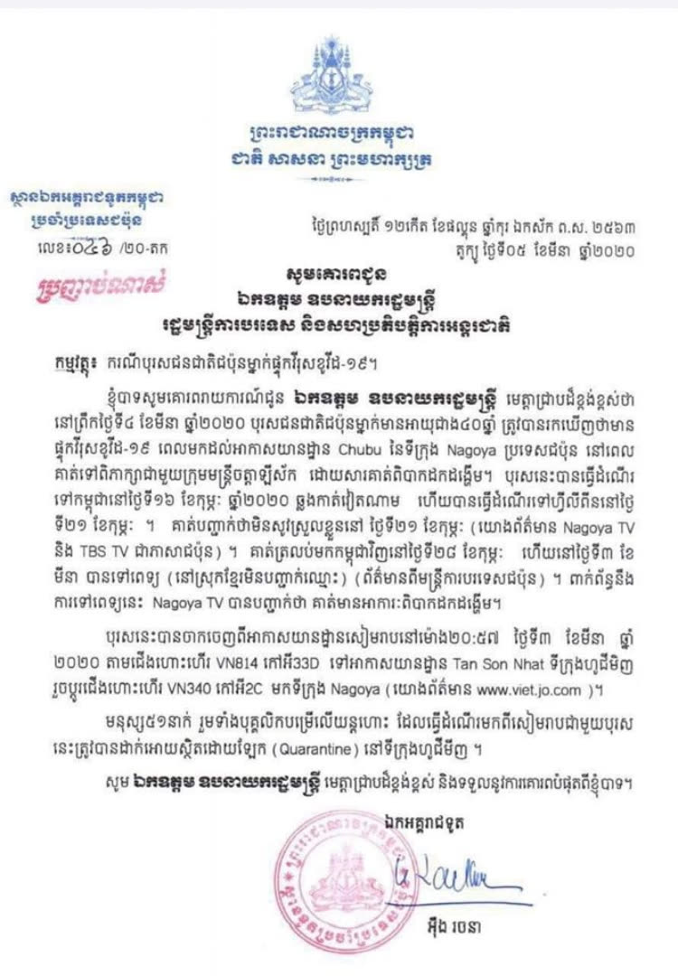 综合柬媒报道,3月5日柬埔寨驻日本大使向柬埔寨外交国际合作部发出公函,证实从暹粒省飞往日本的日本男子确诊为新冠肺炎患者。