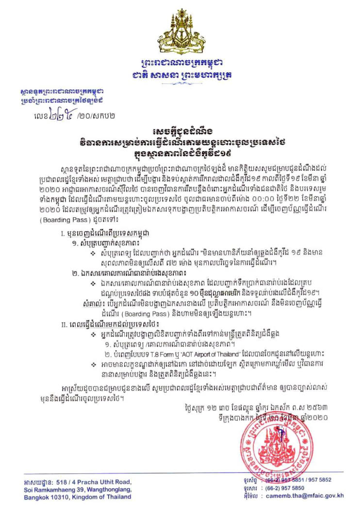 以下是柬埔寨驻泰国大使馆发出给柬埔寨公民的通告