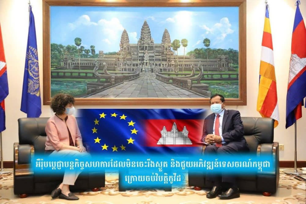 【柬埔寨头条综合报道】5月28日,旅游部部长唐坤与欧盟驻柬埔寨大使Carmen Moreno在旅游部举行的工作会议上,Carmen Moreno女士承诺,在全球的新冠疫情缓解后,欧盟将进一步支持柬埔寨旅游业的发展,特别是在发展旅游业的生态旅游和人力资源方面,将加强与柬埔寨旅游部的合作。