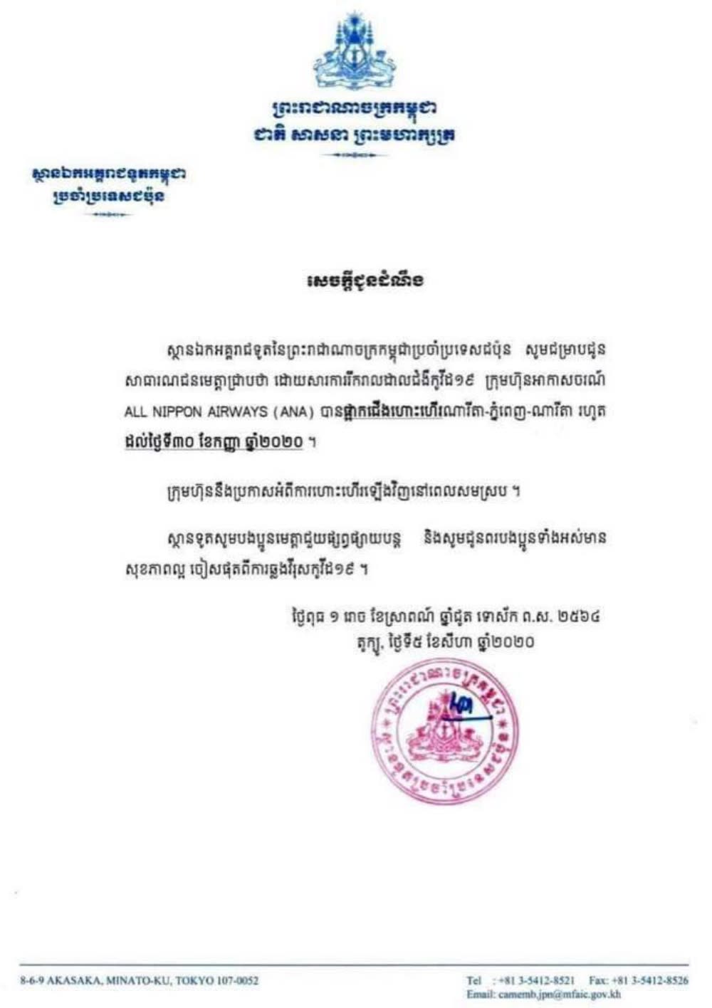 柬埔寨驻日本大使馆强调,ANA全日空航空公司将在适合时间重新通知复航消息。