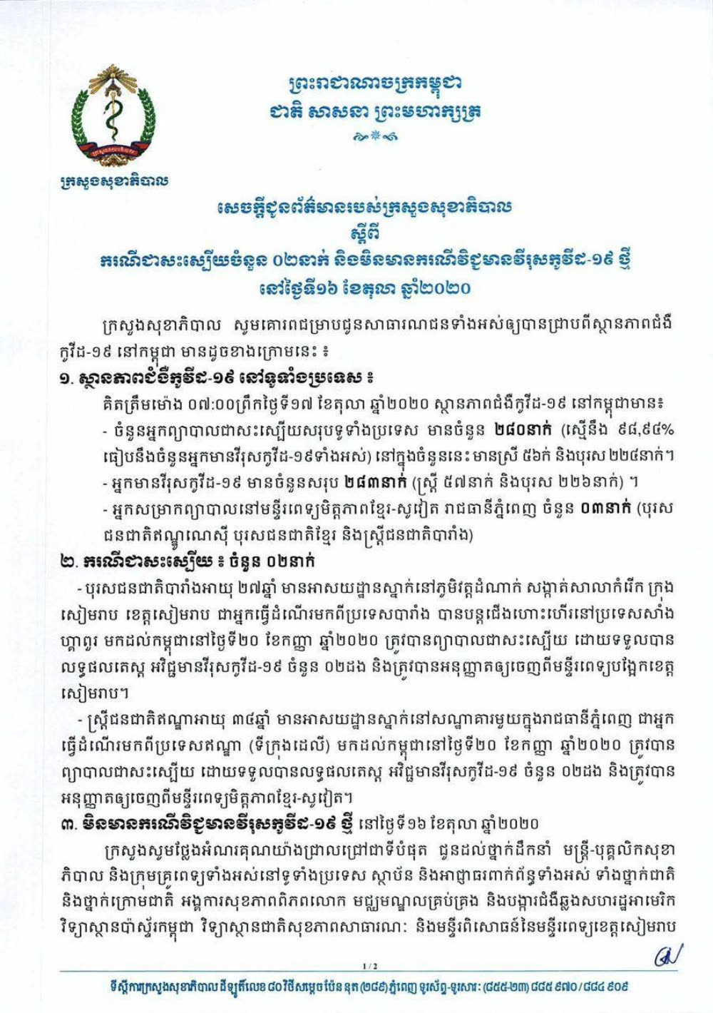 【柬埔寨头条综合报道】根据柬埔寨卫生部10月17日上午发布的公告称,昨日无新增确诊病例,新添2例治愈病例。